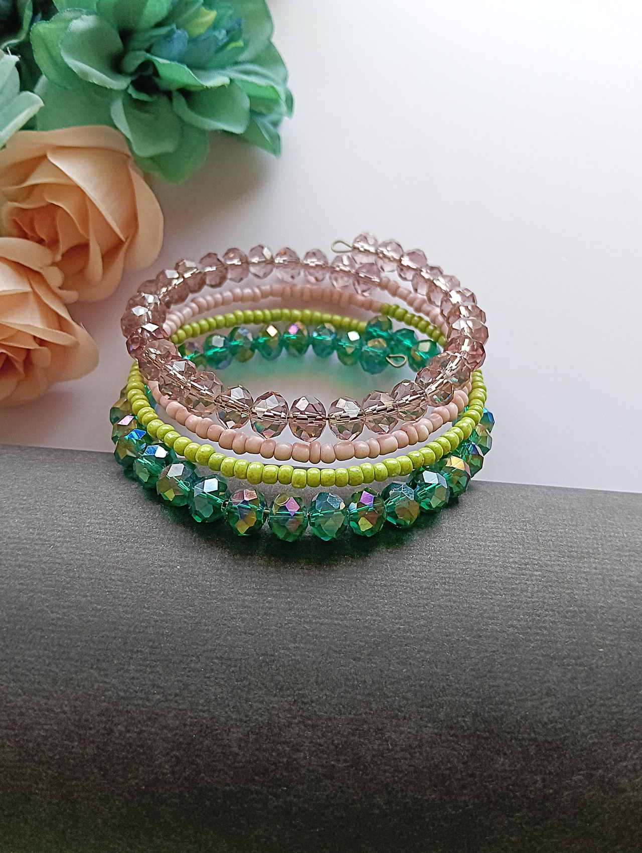Exquisitely Handmade pink and green beaded memory wire wrap bracelet