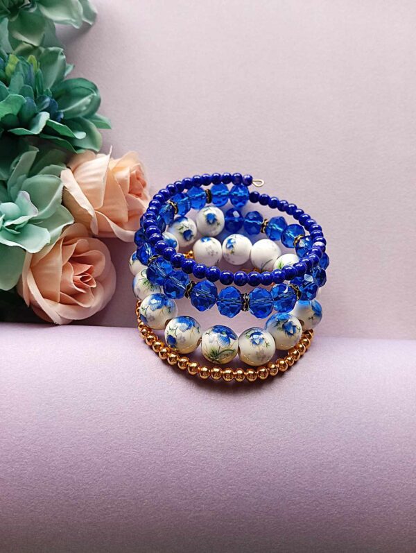 Exquisitely Handmade blue, golden and white porcelain beaded memory wire wrap bracelet