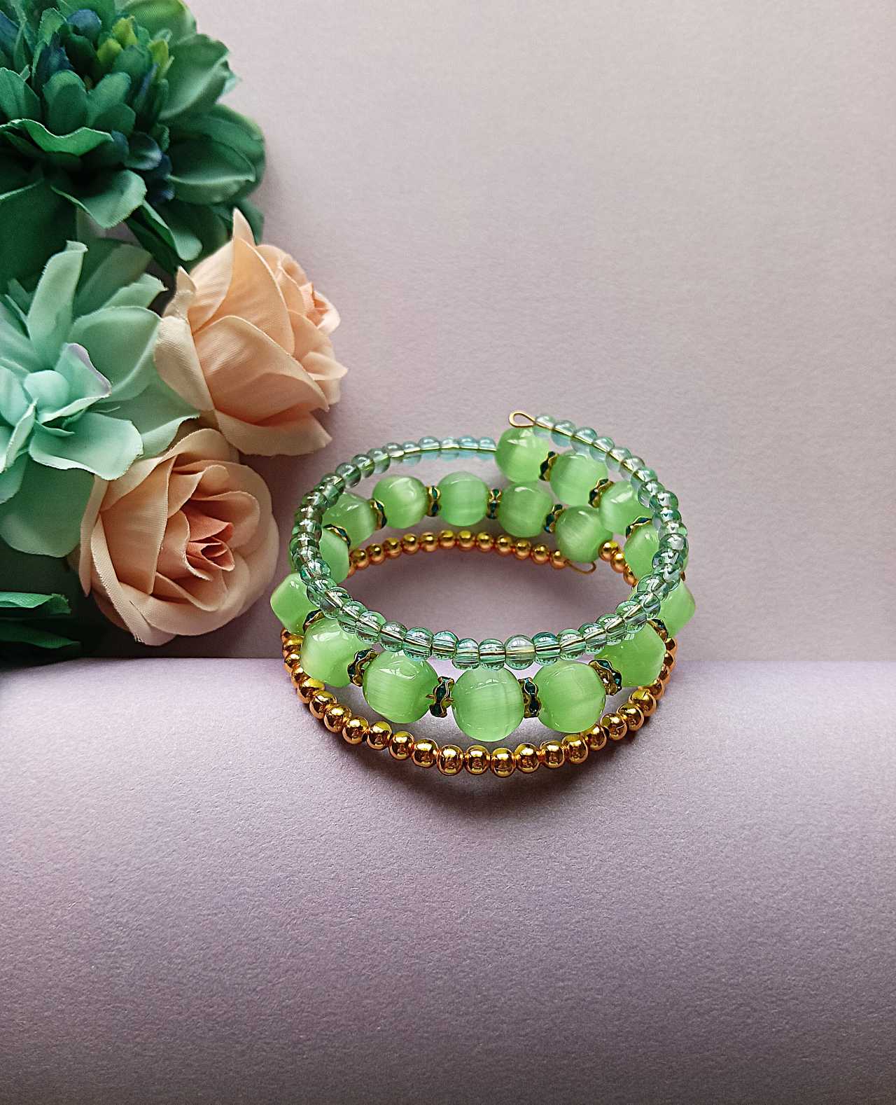 Exquisitely Handmade green and gold beaded memory wire wrap bracelet